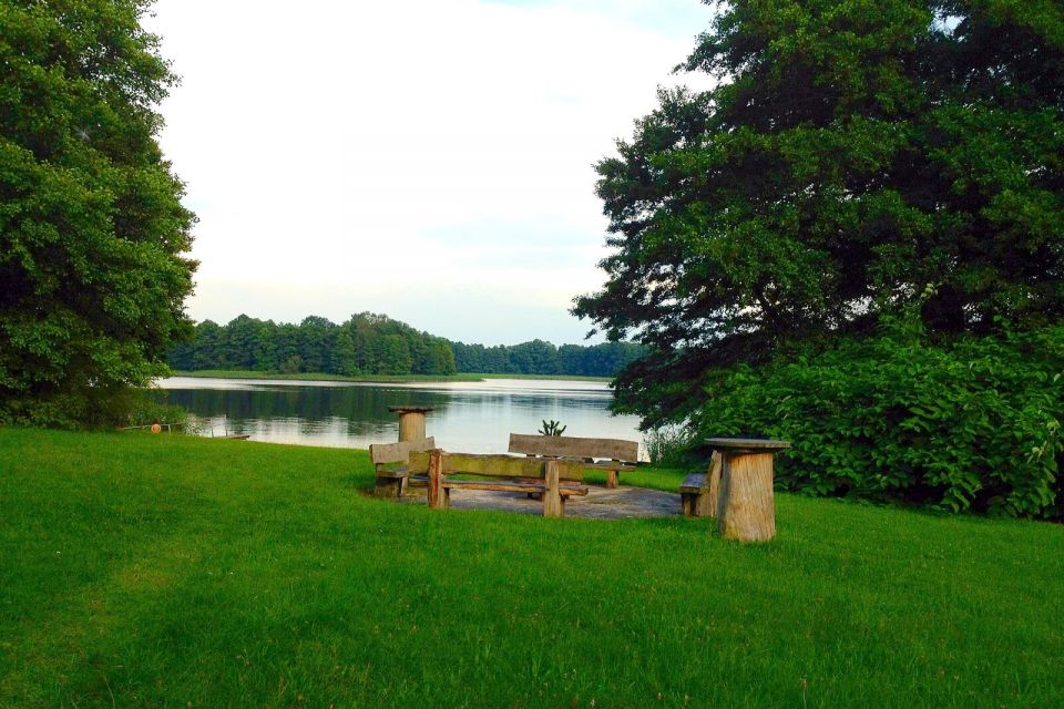 Im Außenbereich befindet sich eine große Terrasse mit Blick zum See. Eine Liegewiese, Grill und Liegen sind ebenfalls vorhanden. Auch vom Grillplatz aus haben die Gäste einen direkten Blick über die spiegelnde Fläche des Sees. Zum Grundstück gehört ein eigener Strand mit Steg und Bänken. Ein Ruderboot und Fahrräder stehen zur Ausleihe bereit.