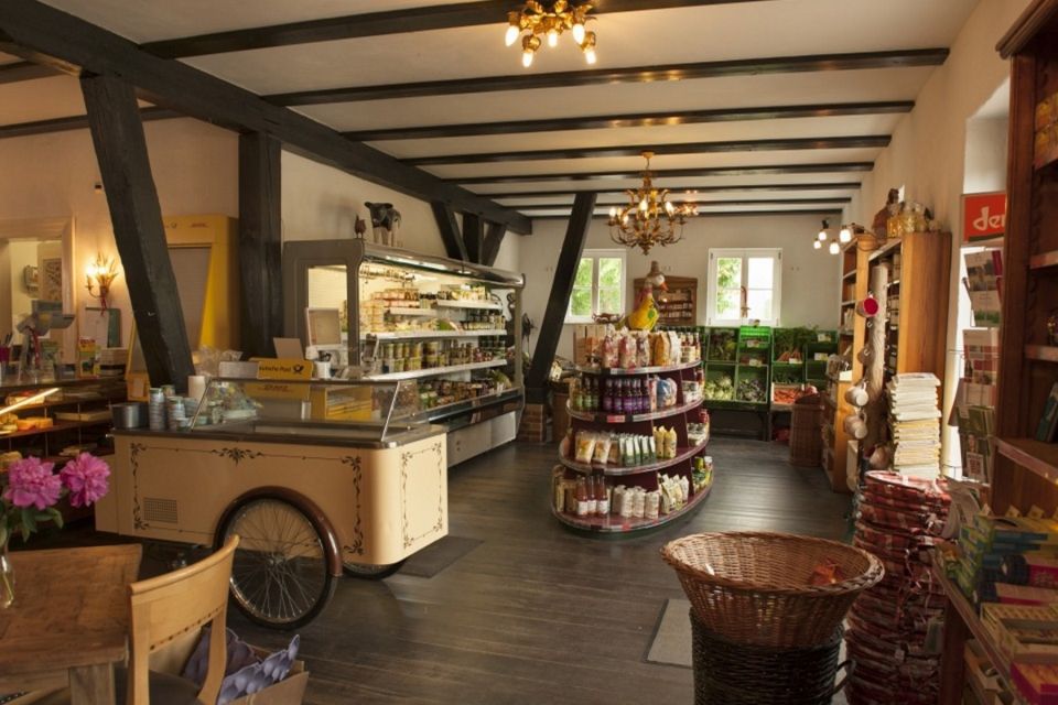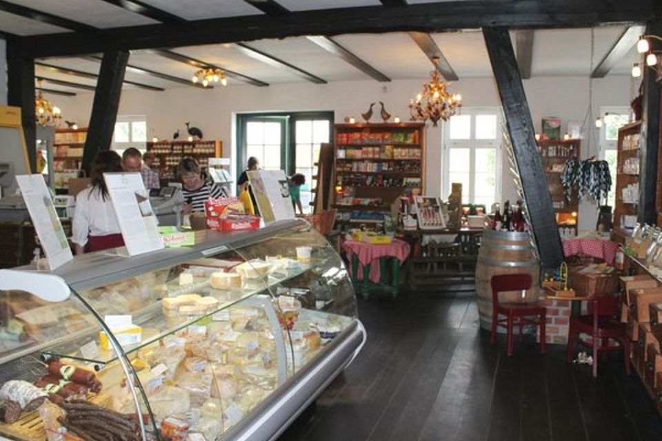 Direkt an die Meierei grenzt der großzügige Hofladen, dessen umfangreiches Sortiment keine Wünsche offen lässt. Die kleine Landküche bietet ein saisonales Tagesangebot mit allerlei Speisen und Getränken, zum Sitzen laden die überdachte Terrasse und das Wiesencafé gegenüber den Kuhställen ein. Gerade im Sommer erfrischt ein Eis des Eiscafés Cadillac aus Templin. Das Ökodorf Brodowin ist ein enger Partner der kleinen Manufaktur in der Uckermark und deren Hauptlieferant von Kuhmilch.