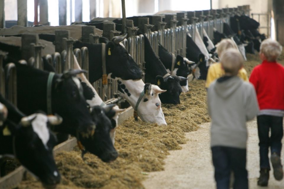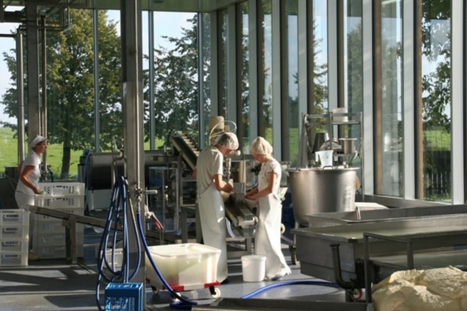 Wo die Milch der Kühe und Ziegen verarbeitet wird, können Besucher direkt sehen: Eine große Glasfassade gibt den Blick in die Produktionsstätte frei. Während der Sommermonate lädt eine Strohhüpfburg Kinder zum Spielen ein.